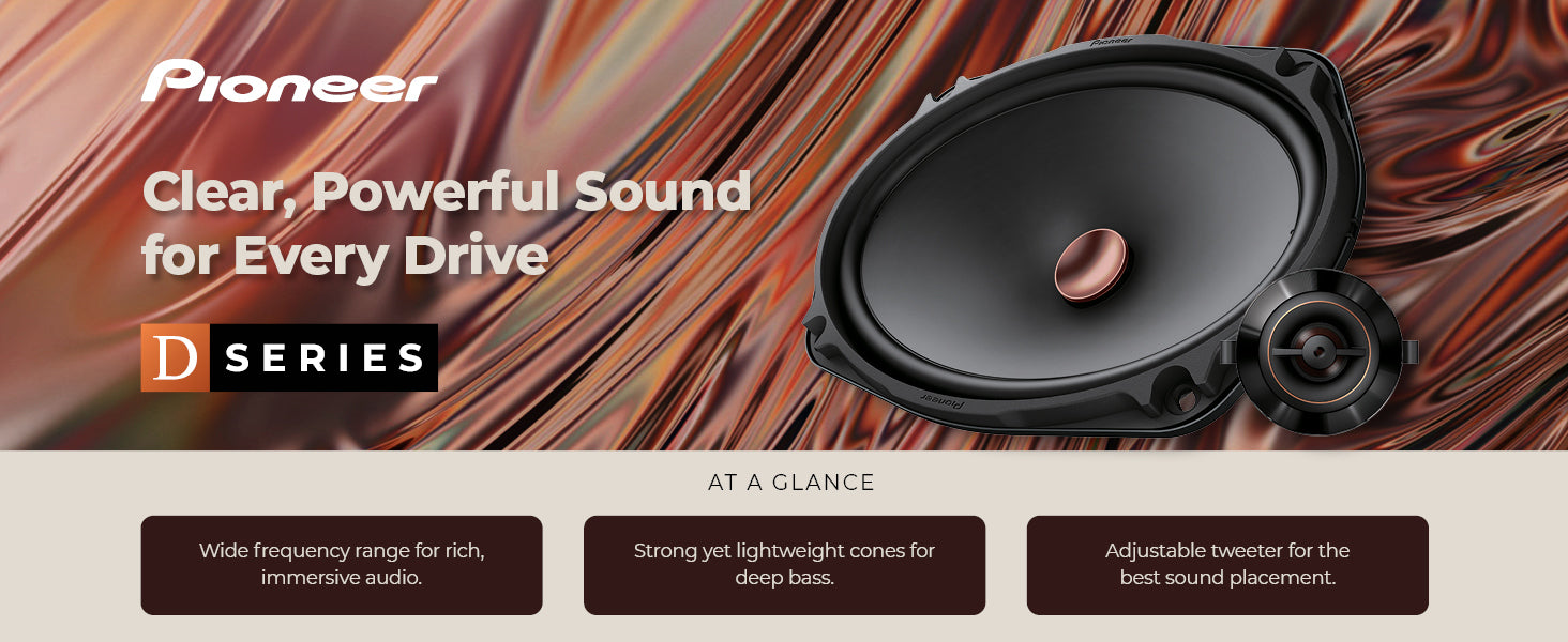 The D-Series is the result of Pioneer’s automotive loudspeaker engineering experience and expertise, combining advanced design techniques with highly developed manufacturing capabilities. Following Pioneer’s OPEN & SMOOTH sound concept, the D-Series provides a broad and balanced frequency response with a wide sound stage and ambience. When paired with one of our Pioneer power amplifiers, these speakers will shine even brighter, delivering absolute acoustic fidelity coupled with beautiful bass extensions.
