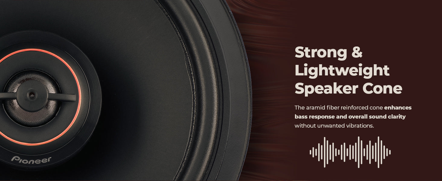 Polypropylene (PP) is a tough thermoplastic resin that is an ideal material for a speaker cone with low mass and high damping. PP cones offer good sensitivity and low distortion. However, basic raw polypropylene cones lack the rigidity and strength required for high output and extreme low bass. To resolve this, Pioneer engineers, using advanced Computer Aided Manufacturing, developed a process to blend aramid fibers into the polypropylene resin during the injection molding process. The resulting aramid fiber interlaced IMPP™ cone is ultra-thin and low mass with high rigidity and superior strength, producing natural, detailed sound with deep and powerful bass.