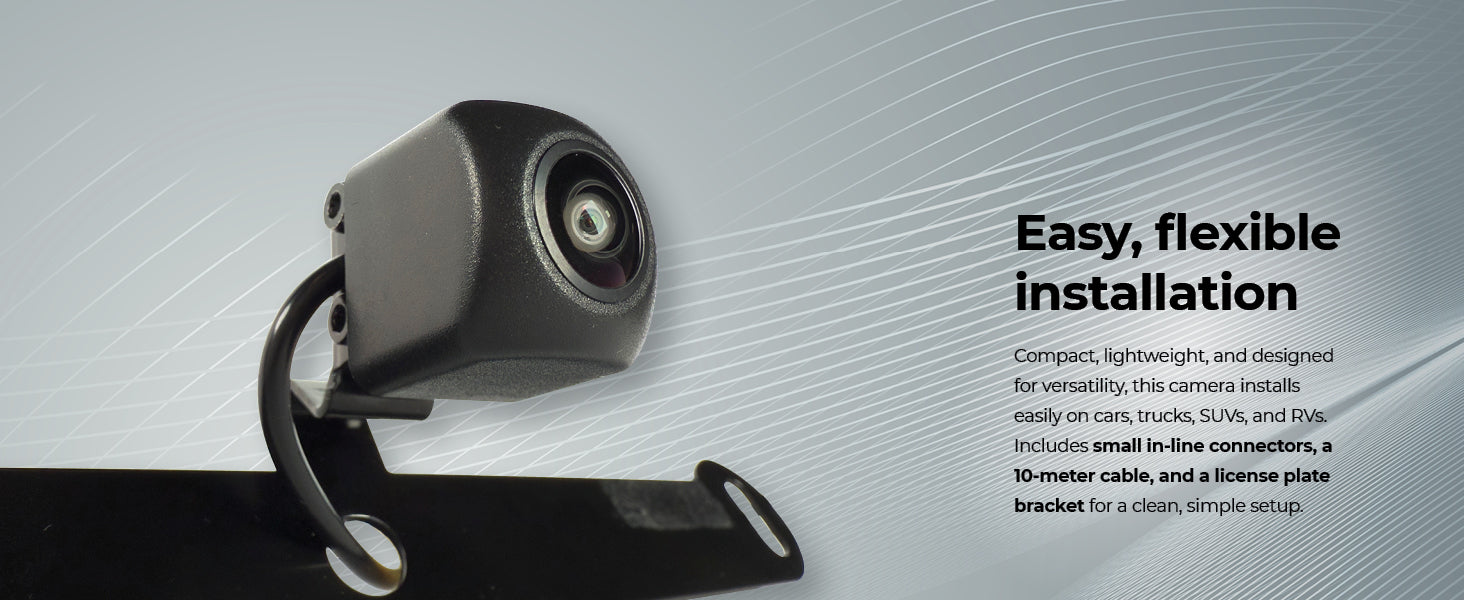 This backup camera utilizes the vehicle's power supply with minimal connections for easier installation, and its compact size allows for hassle-free mounting. It also includes a 10-meter cable for installation on long trucks, SUVs, and recreational vehicles. To assist with the installation process, we designed this camera with small in-line pen-type connectors, making it easier to route the wire into the cabin without the need for large holes.
