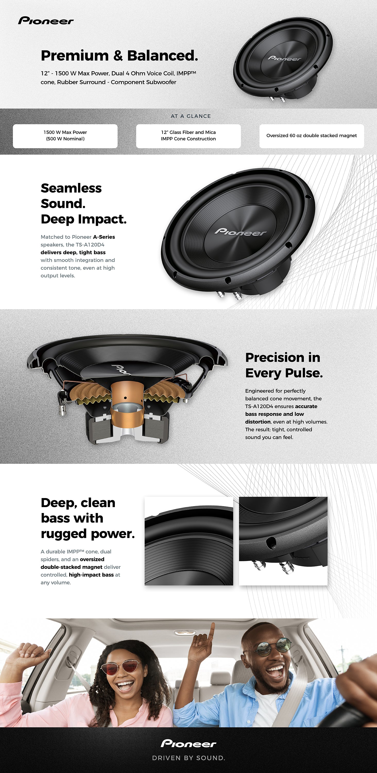 The highly efficient design of the Pioneer A Series speakers intentionally matches the subwoofer and full-range loudspeakers to provide seamless and smooth sound characteristics, with dynamic, high-impact bass that lets you hear and feel the music. Pioneer's OPEN & SMOOTH sound concept ensures a seamless transition between the midrange and tweeter drivers, delivering a uniform off-axis frequency response optimized for automotive applications, where one or more speakers are often aimed away from the listeners' ears. The A Series lineup enhances audio details and improves acoustic performance.