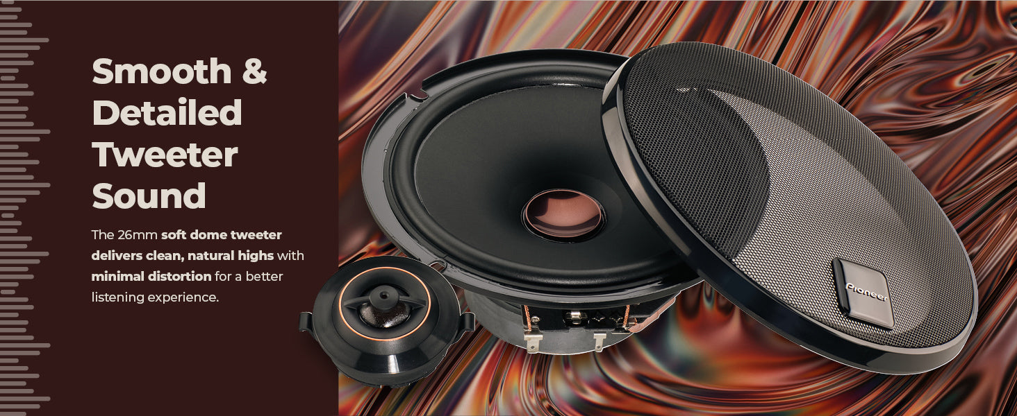Pioneer’s OPEN & SMOOTH sound concept ensures a seamless and smooth transition between the midrange and tweeter drivers, delivering a uniform off-axis frequency response. This design is optimized for automotive applications where one or more speakers are often aimed away from the listeners’ ears.
