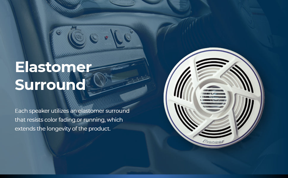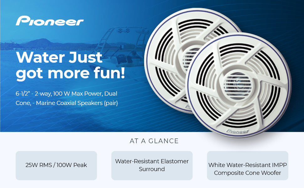Pioneer's popular injection molded polypropylene (IMPP) cones produce outstanding mid-bass response and resist the effects of salt water, humidity and extreme heat.