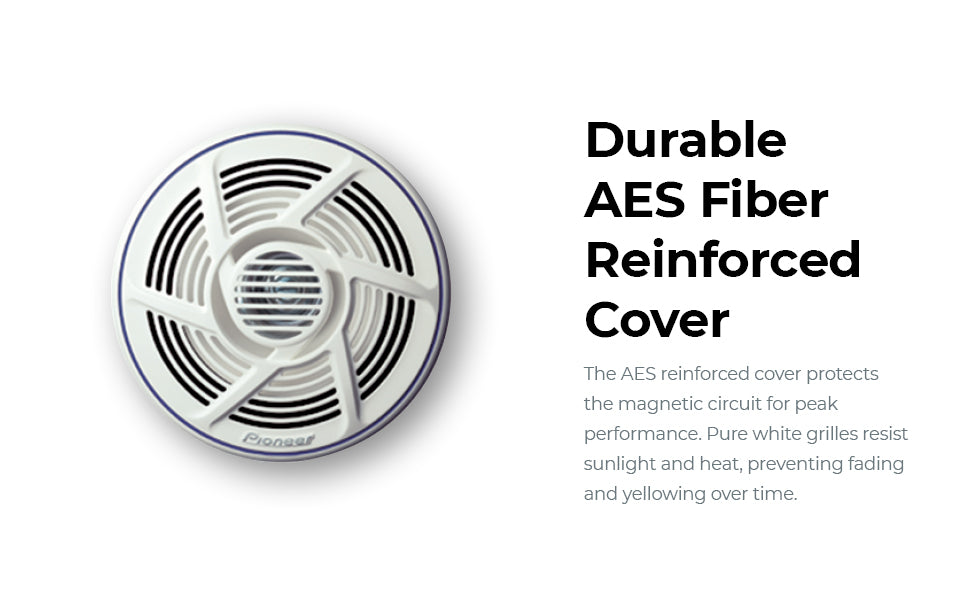 The AES cover protects the magnetic circuit that can affect the performance of the speaker. The speakers also sport the pure white AES grilles to resist fading and yellowing caused by direct sunlight and heat.