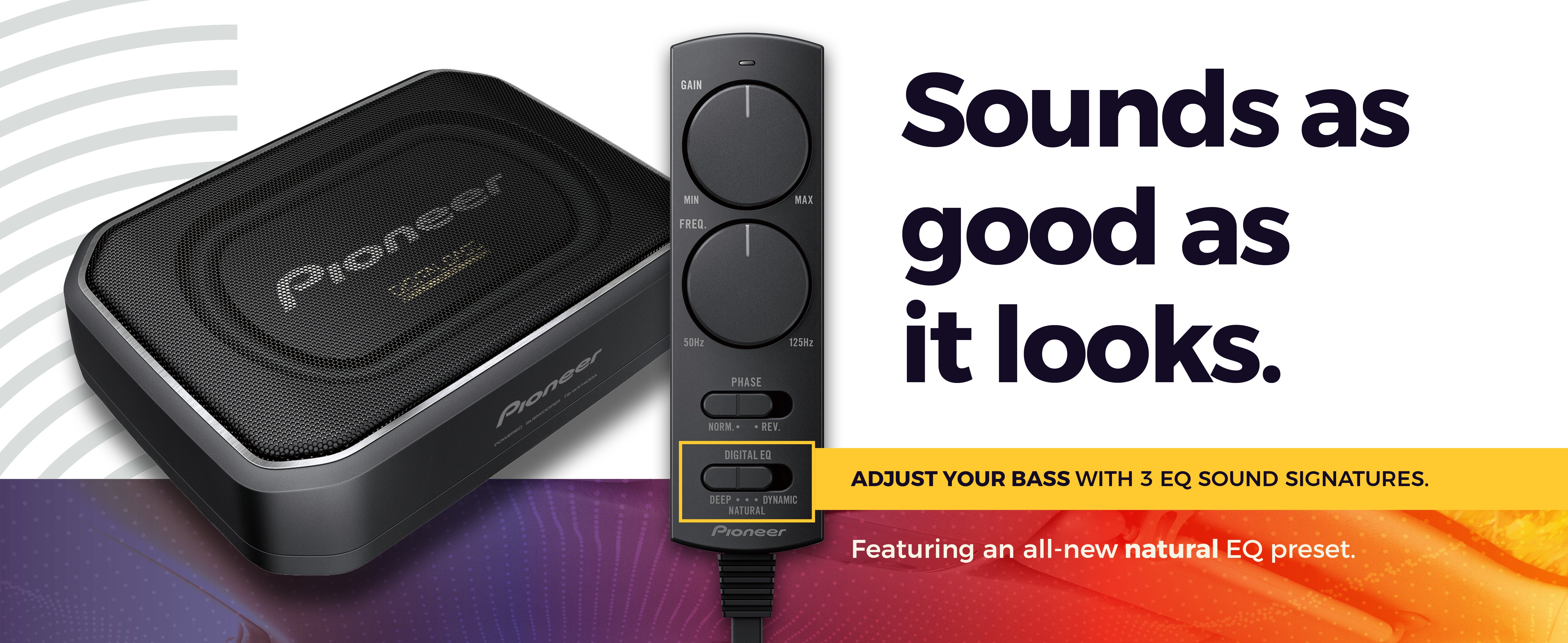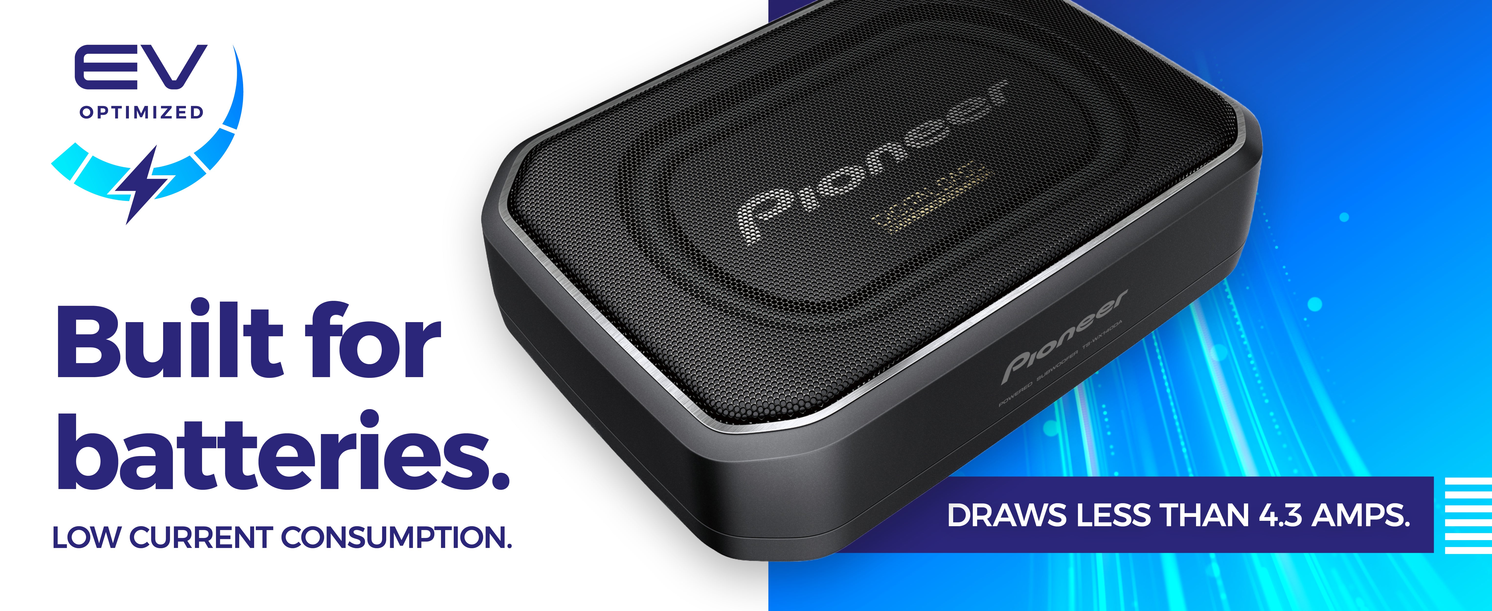 The TS-WX140DA features built-in high-efficiency Class-D amplification, offering an ultra-low average current consumption of only 4.3 amps (max). This allows the unit to be installed without the need for heavy-gauge wires to power the internal amplification. In fact, this current consumption is so low that this amplified subwoofer is the ideal solution for adding bass to music in an electric vehicle.
